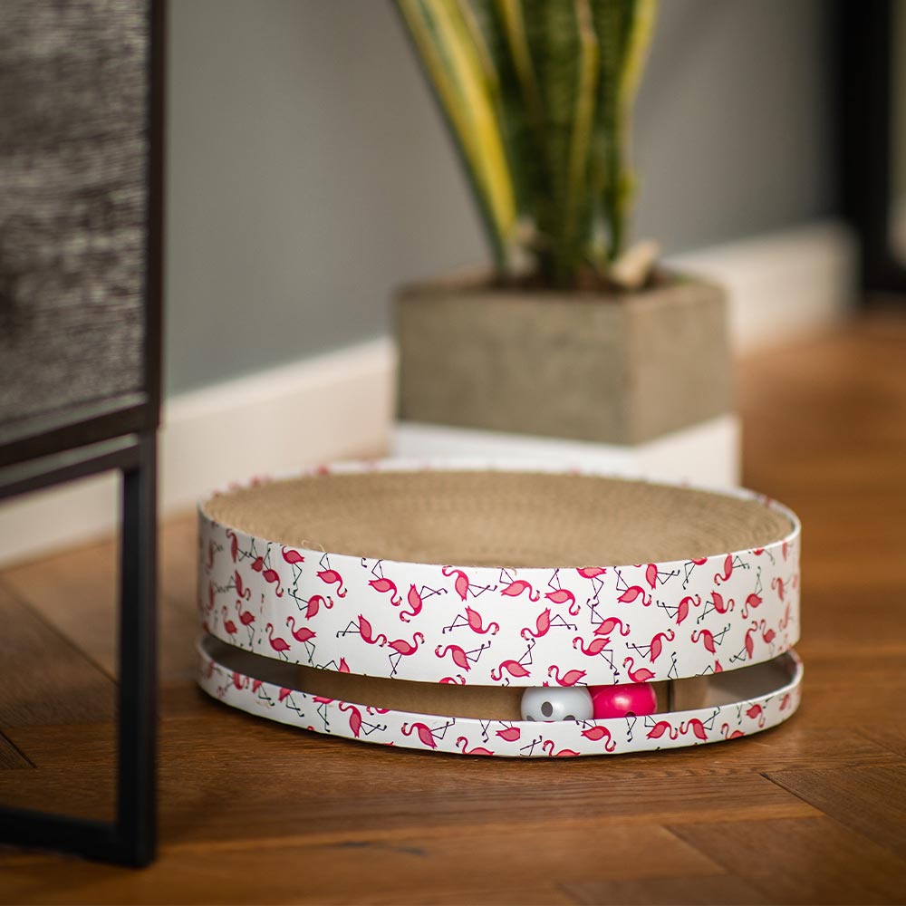 Dit leuke Quapas! krabbed van recyclebaar golfkarton is voorzien van een leuk flamingomotief en speelbal. Je kat kan hier leuk mee spelen, aan krabben of lekker op gaan liggen.