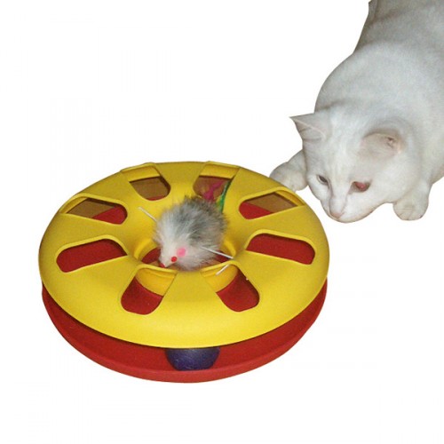 Leuk uitdagend kattenspeelgoed met in de binnenzijde een speelballetje en bovenop een harige speelmuis. Een groot succes voor elke poes, kat of kitten.