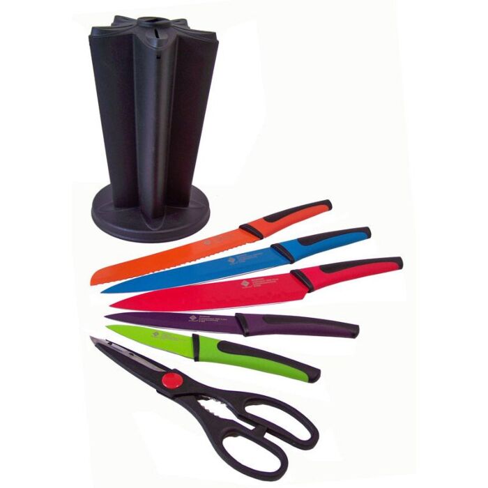 De non-stick coating op de messen voorkomt dat voedsel eraan blijft plakken, wat het snijden en bereiden van voedsel makkelijker maakt. De schaar in de set is multifunctioneel en kan voor verschillende taken in de keuken gebruikt worden. Met de kunststof standaard blijft uw messenset georganiseerd en gemakkelijk toegankelijk, wat ruimte bespaart in uw keukenlade.