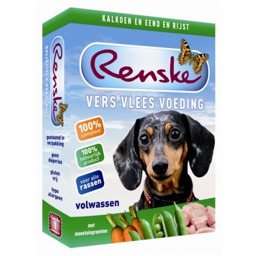 Renske vers vlees Kalkoen en Eend is een 100% natuurlijke hondenvoer! Dit natvoer is een complete vers vlees voeding voor honden. Door zijn natuurlijke samenstelling is Renske natvoer zeer geschikt voor honden die slecht reageren op droog- en of blikvoeding of andere soorten van vlees.
