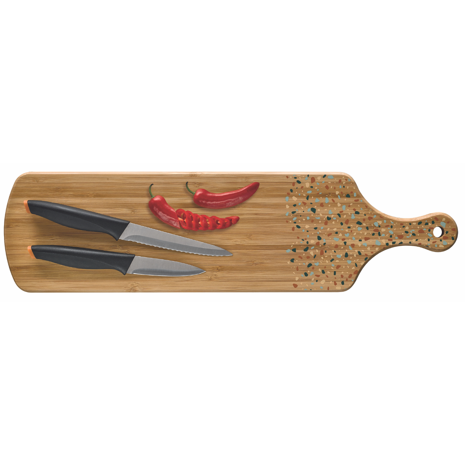 Deze snijplank is ideaal voor dagelijks gebruik in de keuken, of het nu gaat om het snijden van groenten, fruit of vlees. De bijgevoegde messen maken het bereiden van maaltijden een plezierige ervaring.