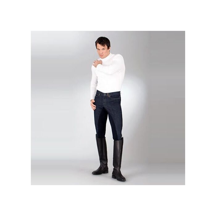 Stijlvolle herenrijbroek van zacht denim voor optimaal comfort en een perfecte fit. Voorzien van twee steekzakken voor- en achteraan en een leren zitvlak voor extra grip en comfort in het zadel.