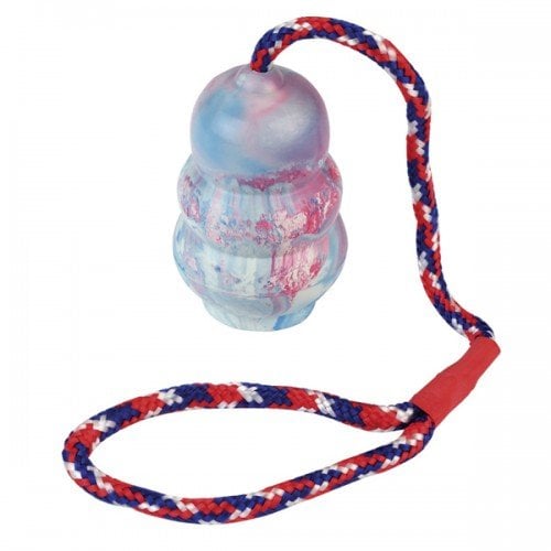 Dit stevige rubberen speeltje met kleurrijk werptouw is perfect voor honden die graag rennen. Dankzij het touw gooit u het speeltje moeiteloos ver weg, zonder teveel kracht te zetten.
