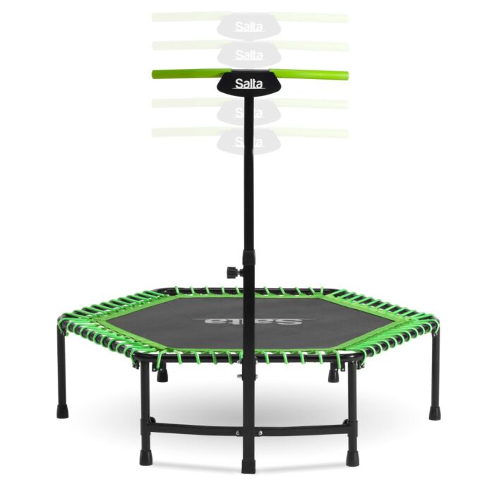 De Salta Fitness trampoline is ontworpen voor diverse fitnessoefeningen en biedt een geluidloze en comfortabele springervaring. De verstelbare groene beugel en solide constructie zorgen voor veiligheid en gemak tijdens trainingssessies.