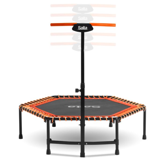 De Salta Fitness trampoline heeft een diameter van 140cm en de beugel is uitgevoerd in een opvallende oranje kleur.