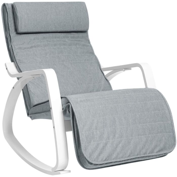 Met een maximaal gewicht van 150 kg en 5 verstelbare standen, biedt deze schommelstoel de perfecte combinatie van functionaliteit en ergonomisch design. Het grijswitte ontwerp voegt een vleugje elegantie toe aan elke kamer.