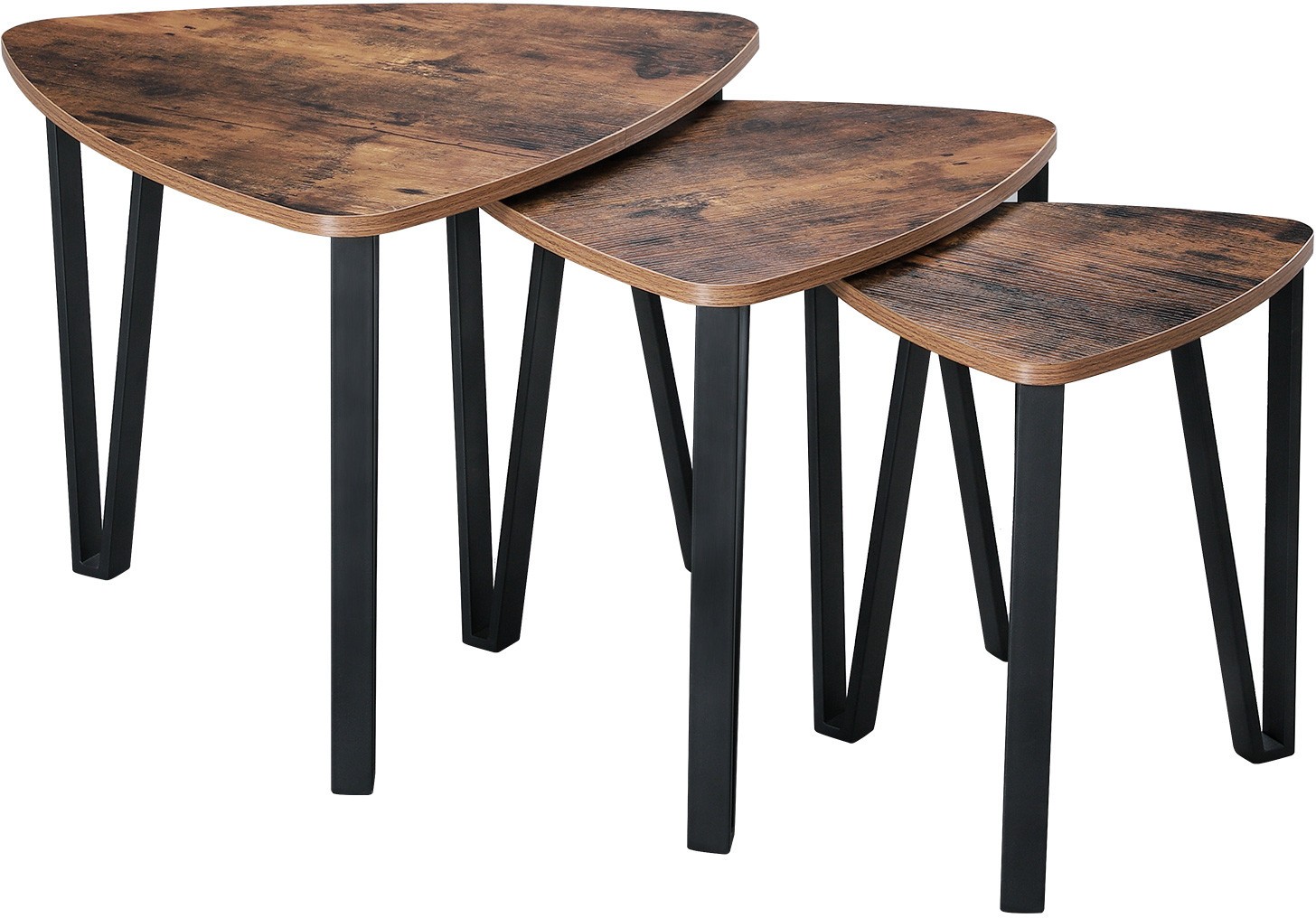 De bijzettafels zijn vervaardigd uit hoogwaardig spaanplaat gecombineerd met een stevig ijzeren frame, wat zorgt voor duurzaamheid en stabiliteit. De afmetingen van de tafels zijn als volgt: de grote tafel meet 58.6 x 58.6 x 45 cm (L x B x H), de medium tafel is 47 x 47 x 42.5 cm (L x B x H) en de kleine tafel heeft een afmeting van 37 x 37 x 40 cm (L x B x H). Het gewicht van de gehele set bedraagt 10.2 kg, zodat ze gemakkelijk verplaatst kunnen worden.
