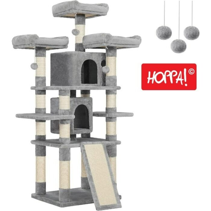Hoppa! Grote Kattenboom in een lichtgrijze kleur is de ultieme speel- en rustplek voor uw geliefde huiskat. Met 3 comfortabele pluche uitkijkplatformen, 2 ruime grotten en een speelplaats op de grondvloer, biedt deze krabpaal alles wat uw kat nodig heeft voor oneindig speelplezier en ontspanning.