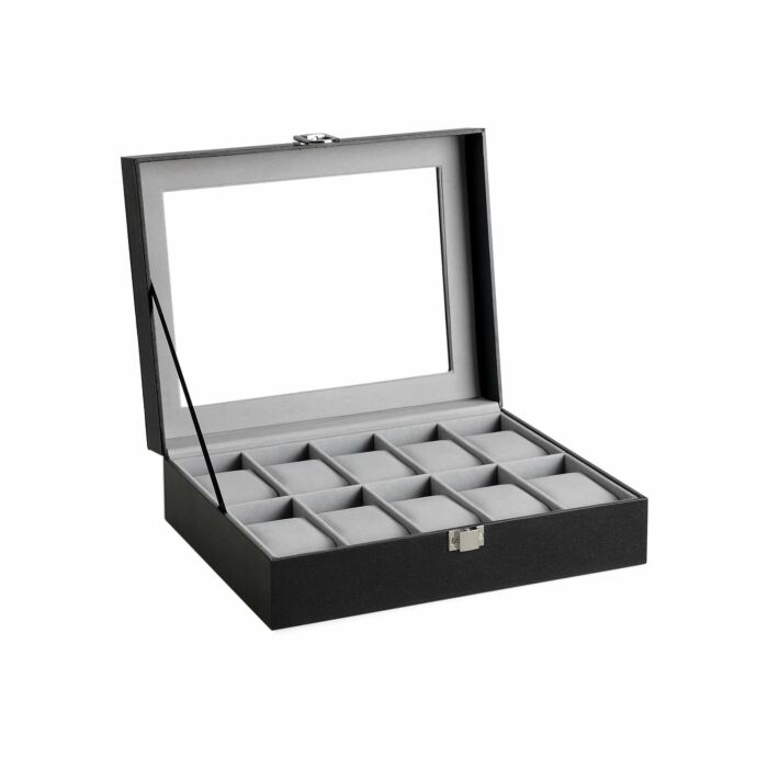 Met 10 vakken en afneembare horlogekussens biedt deze horlogebox een georganiseerde opslagoplossing voor je horloges. Het transparante glazen deksel maakt het gemakkelijk om je collectie te bekijken en snel het juiste horloge te kiezen.