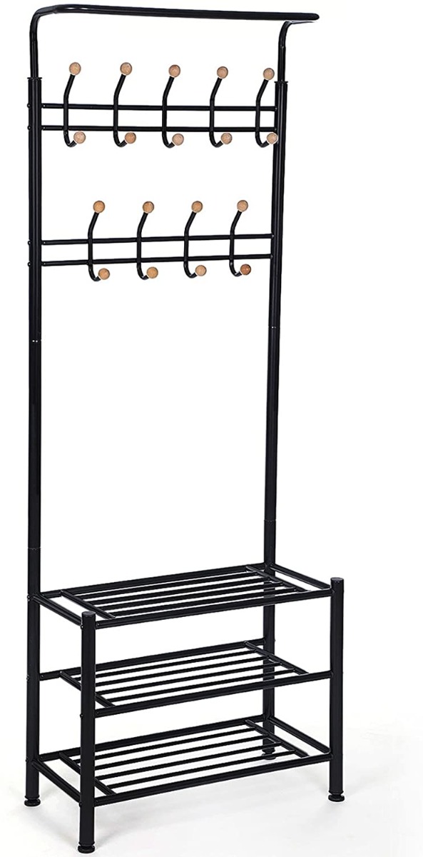 Vervult zijn doel optimaal: de kapstok heeft 18 haken bovenaan voor jassen, sjaals, riemen, tassen enz. Elke haak draagt tot 5 kg. Onderaan bevinden zich drie planken voor schoenen, opbergdozen en meer. Veelzijdig: het oppervlak is gepoedercoat, modern en chique, en past perfect in de hal, woonkamer, slaapkamer enzovoort. Uitstekende stabiliteit: de framebuizen hebben een diameter van 32 mm voor extra stevigheid. De dwars- en zijbuizen van de onderste twee steunen zijn respectievelijk 19 mm en 16 mm Ø, waardoor elke steun tot 40 kg kan dragen. Hoogteverstelbare vloergeleiders: in plaats van normale eindkappen biedt de kapstok verstelbare vloergeleiders om kleine oneffenheden te compenseren. Eenvoudige montage: de haken en stangen zijn gelast, dus u hoeft geen schroeven meer vast te draaien. Geïllustreerde montage-instructies worden meegeleverd.