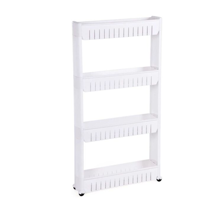 Dit reuze handige 4-laagse rek is slechts 12,7 cm diep en past daardoor in ruimtes die anders verloren zouden zijn. Dankzij de wieltjes verplaats je het rek eenvoudig naar iedere gewenste plek. Erg praktisch in de keuken, maar ook in de badkamer of woonkamer.