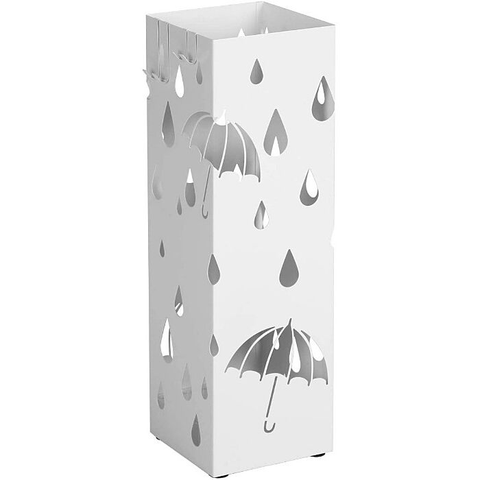 Het stijlvolle gatenpatroon van regendruppels en paraplu's is ontworpen voor functionaliteit en esthetiek. De paraplubak is voorzien van een wateropvangbakje, waardoor uw vloer beschermd blijft tegen waterdruppels. Bovendien zijn er twee haken toegevoegd voor het ophangen van extra items, wat de gebruiksvriendelijkheid bevordert.