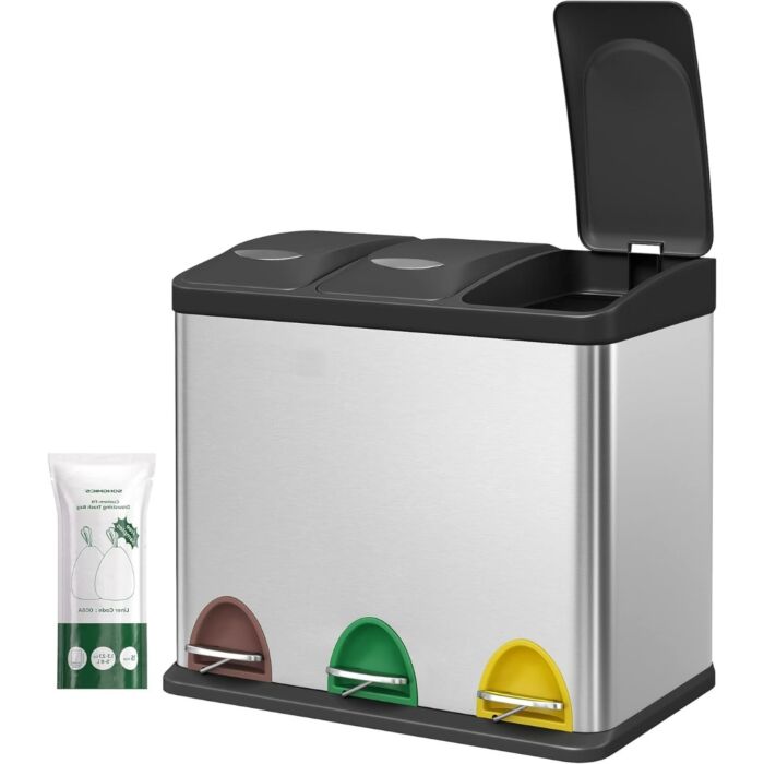 Het pedaalmechanisme zorgt voor een stille en gemakkelijke opening van de deksel. Met drie stevige kunststof binnenemmers wordt afvalscheiding kinderspel. Het strakke design houdt geurtjes binnen en maakt schoonmaken eenvoudig.