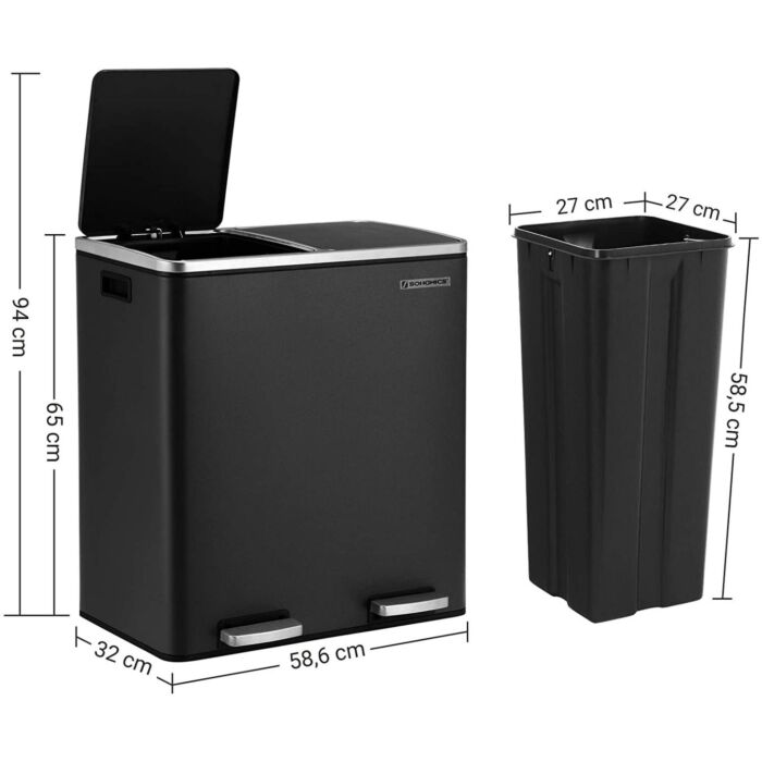 Deze afvalbak heeft een ruime inhoud van 60 liter en is gemaakt van hoogwaardig roestvrij staal, wat zorgt voor duurzaamheid en een lange levensduur. De zwart gepoedercoate afwerking geeft het een chique uitstraling.