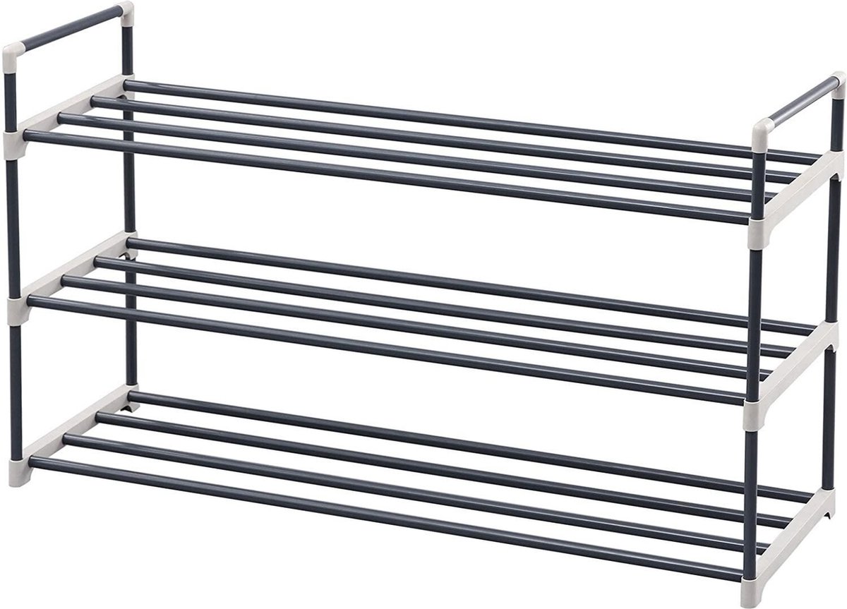 Het Hoppa! schoenenrek is een stevig 3-laags rek dat ideaal is voor het organiseren van uw schoenencollectie. Gemaakt van zware metalen buizen en hoogwaardige PP-kunststof connectoren, kan dit rek een belasting tot 12 kg aan. Elke laag biedt ruimte voor 5 paar damesschoenen of 4 paar herenschoenen, waardoor u gemakkelijk 12-15 paar schoenen kunt opbergen.