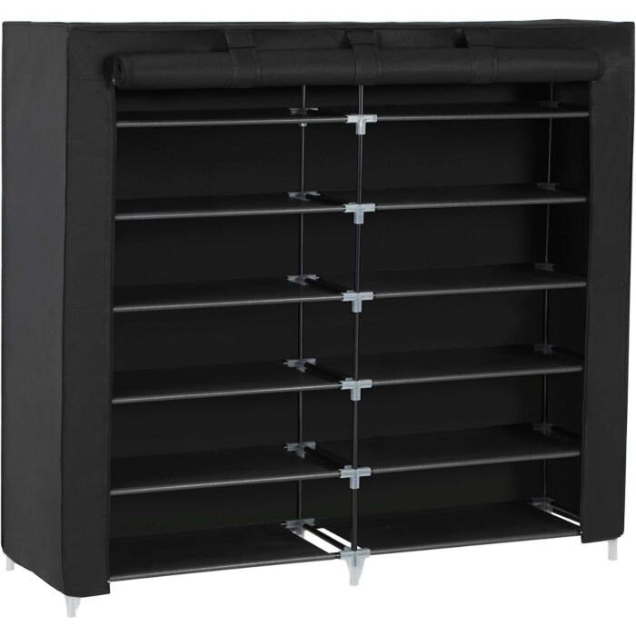 Het Hoppa! Schoenenrek met 7 planken en stofkap in zwart fleece is vervaardigd met hoogwaardige materialen en biedt comfort, functionaliteit en duurzaamheid. Dit schoenenrek is ideaal voor het opbergen van verschillende soorten schoenen, accessoires, en meer.