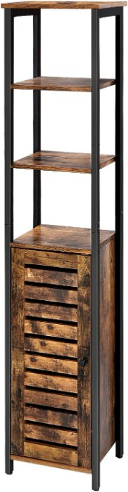Deze opbergkast heeft afmetingen van 38 x 31 x 168 cm (B x D x H) en is gemaakt van stevig spaanplaat in een bruin/zwart kleurenschema.