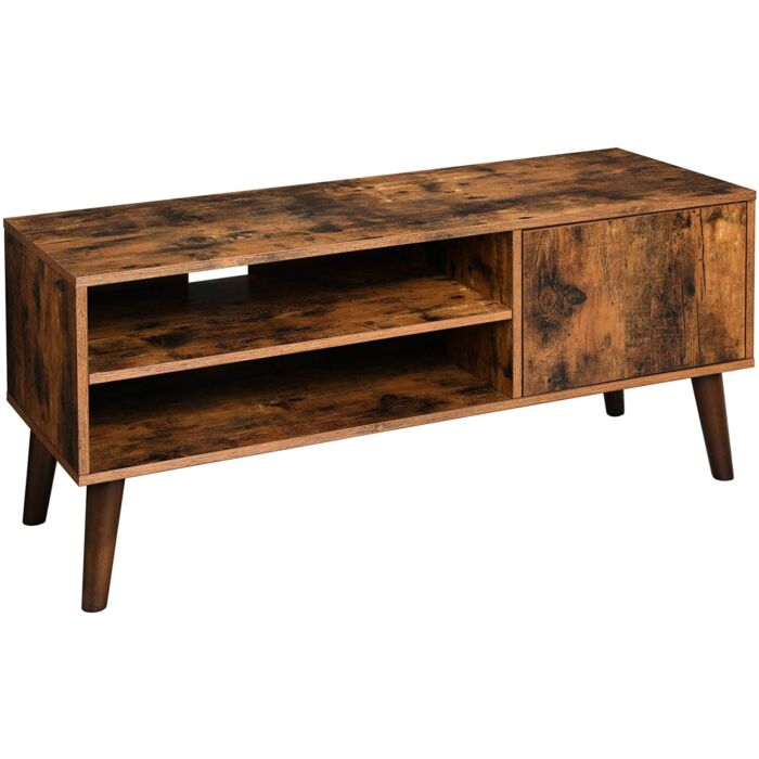 Alles komt terug: goede stijl keert altijd weer. Ontdek je interieur met dit charmante lowboard in jaren ’50/’60-stijl. Dit retro meubel past perfect in moderne, veelzijdige ruimtes waar nog plek is voor een tv (tot 109 cm). Het tv-meubel heeft twee planken en een ruim tafelblad voor je televisie, ontvangers en dvd’s. Achter de kastdeur berg je kleine accessoires binnen handbereik op. De schuine poten van massief rubberhout zorgen, met schroeven en houten deuvels, voor extra stabiliteit. Het robuuste houtspaanplaat frame is belastbaar tot 50 kg. Vloerbeschermers en achterwandbevestigingen worden meegeleverd voor extra stevigheid.