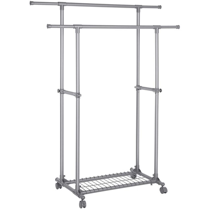 Deze verstelbare dubbele kapstok is grijs van kleur en gemaakt van stevig metaal. De afmetingen zijn 87 x 52 x 166 cm, wat voldoende ruimte biedt voor al je kledingstukken.