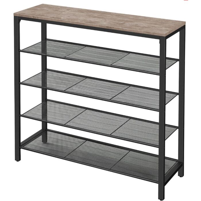 Dit prachtige schoenenrek van Hoppa! combineert functionaliteit met een trendy industriële stijl. Het rek beschikt over 4 stevige zwarte gaasplanken, waardoor u al uw schoenen op een stijlvolle manier kunt opbergen. Het rustieke grijze bovenblad kan uitstekend worden benut voor het plaatsen van tassen, sleutels of decoratieve items, wat het een multifunctioneel meubelstuk maakt voor uw entree.