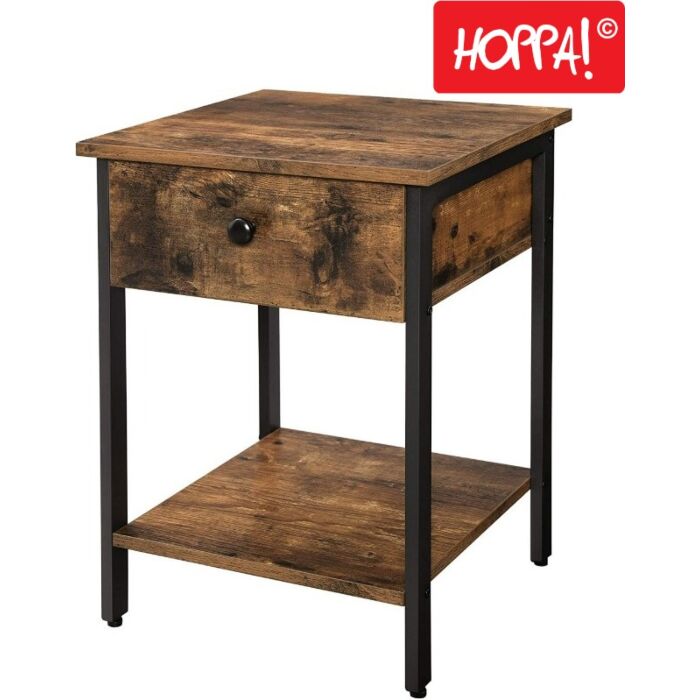 Dit Hoppa! Vintage Nachtkastje/Bijzettafel combineert stijl en functionaliteit perfect. Met een stevig stalen frame en stevig spaanplaat is dit nachtkastje duurzaam en praktisch. De bruine kleur geeft een vintage touch aan uw interieur. Het compacte formaat van 41 x 41 x 56 cm (B x D x H) maakt het ideaal voor gebruik naast een bed of als bijzettafel in de woonkamer.