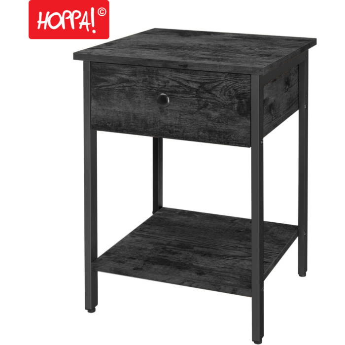 Het Hoppa! Vintage Nachtkastje/Bijzettafel combineert perfecte vintage charme met praktische functionaliteit. Dankzij het stevige metalen frame en de duurzame spaanplaat is dit nachtkastje bestand tegen dagelijks gebruik. De prachtige zwarte afwerking geeft een authentiek retroaccent aan elk interieur. Met een compact formaat van 40 x 40 x 55 cm past het zowel naast uw bed als in de woonkamer.