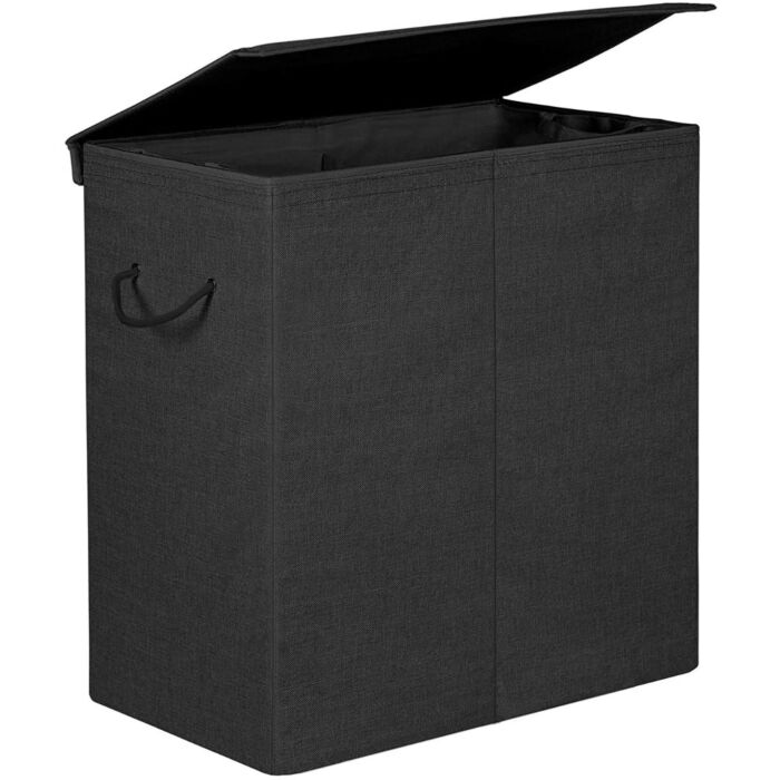 Deze wasmand biedt 142L opbergruimte en is voorzien van een deksel voor het verborgen houden van vuile was. De waszak is verdeeld in 2 compartimenten voor het scheiden van kleren op kleur of materiaal. Het ontwerp maakt het gemakkelijk te vouwen en te transporteren met handgrepen aan de zijkant.