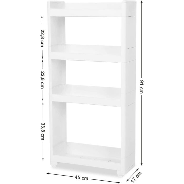 Met zijn slanke ontwerp past deze niche-rekker perfect in ongebruikte ruimtes en biedt een ruimtebesparende manier om meer op te slaan in de keuken, badkamer of woonkamer. De trolley is voorzien van 4 wielen voor eenvoudige verplaatsing en gemakkelijke toegang waar het nodig is. De robuuste polypropyleen constructie maakt de trolley stabiel en duurzaam, waarbij elke plank tot 5 kg kan dragen. Bovendien is de trolley waterdicht en gemakkelijk schoon te maken, waardoor het ideaal is voor gebruik in de badkamer en keuken. De montage is eenvoudig en gereedschapsvrij dankzij de kunststof verbindingsstukken.