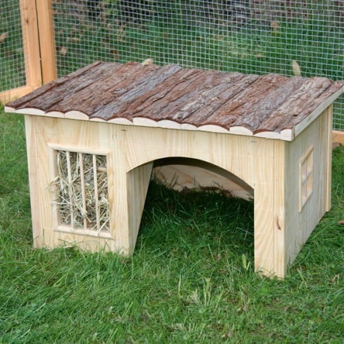Met dit sfeervolle houten speelhuisje heeft uw dier een fijne plek om te rusten, spelen en eten uit de eigen hooiruif. Volledig vervaardigd uit natuurlijke materialen. Ideaal voor in het konijnenhok of de buitenren.