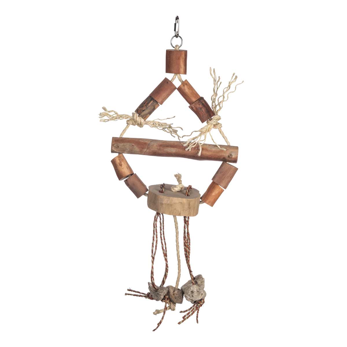 Het speeltje heeft een formaat van 55x23 cm, waardoor het ideaal is voor papegaaien van verschillende groottes. Gemaakt van een combinatie van koffiehout en spiderhout, biedt het stevigheid en een natuurlijke textuur die geschikt is voor de snavels van vogels.
