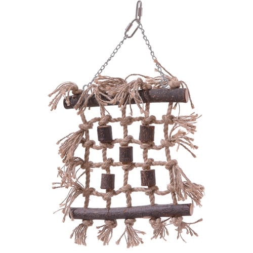 Het speelnet heeft een compacte afmeting van 24 x 24 cm, ideaal voor zowel kleine als grotere vogelkooien. Het is vervaardigd van stevige, natuurlijke materialen zoals dennenhout, waardoor het speelnet niet alleen duurzaam is, maar ook een aantrekkelijke uitstraling heeft die past in elke kooi.