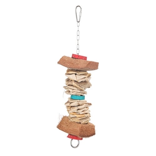 Quapas! Vogelspeeltje Upper S is speciaal ontworpen voor kleine kromsnavels, zoals parkieten en andere kleine vogelsoorten. Met afmetingen van 26×7 cm past dit speeltje perfect in hun kooi en biedt het urenlang speelplezier. Gemaakt van duurzaam koffiehout en bananenblad, creëert het een veilige en natuurlijke speelomgeving.