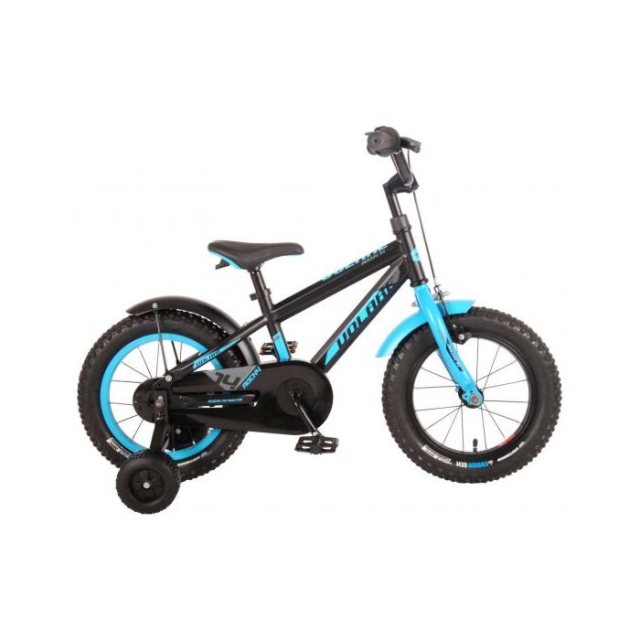 Volare Rocky 14 inch kinderfiets 95% afgemonteerd. De Volare Rocky kinderfietsrange is echt van superieure kwaliteit. De Rocky fiets heeft aluminium velgen, een aluminium stuurpen, betere kwaliteit trappers, zwarte spaken en een luxe super zacht zadel met greep voor ouders. De 14 inch Rocky is een stoere jongensfiets met extra brede banden, waar ieder kinderhart sneller van gaat kloppen. Ook de spatborden zijn extra groot en mooi gevormd waardoor zij al het opspattende vuil tegenhouden. Het stuur is in hoogte verstelbaar en de zadelbuis is extra laag met een extra lange zadelpen, waardoor de fiets met uw kindje mee kan groeien. Om vaart te minderen heeft deze fiets een handrem en terugtraprem. De handvatten zijn gemaakt van Kraton, een zacht rubber, waardoor de handvatten heerlijk in de hand liggen. Het geometrische frame in de zwart blauwe kleur met watertransfer stickers maakt van deze fiets een echte eyecatcher. De fiets heeft extra brede stoer uitziende zijwieltjes om snel te kunnen leren fietsen en een gesloten kettingkast om de kleine vingertjes te beschermen. Deze fiets is dé fiets om kinderen te inspireren om de wereld te gaan ontdekken. Bovendien is de fiets voor 95% afgemonteerd, dus bijna fietsklaar. Wel zo gemakkelijk!
