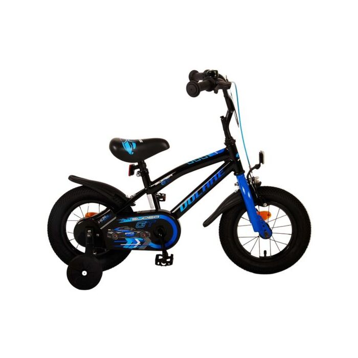 Voor ieder kind is leren fietsen een feestje met de Volare Super GT 12 inch kinderfiets! Veiligheid staat voorop! Daarom heeft deze gave fiets een handrem en terugtraprem, een gesloten kettingkast en afneembare zijwieltjes. Daarnaast heeft de fiets reflectoren in de wielen, voor- en achterop de fiets en een leuke bel. Ook aan het comfort is gedacht. De mooie zwarte Volare fiets met blauwe accenten heeft een zacht zadel, een tijdloos design, en een uniek frame dat wel tegen een stootje kan. Om zo lang mogelijk van de fiets te kunnen genieten zijn het zadel en stuur in hoogte verstelbaar. Wordt geleverd inclusief al het montagemateriaal dat nodig is om de fiets in elkaar te zetten!