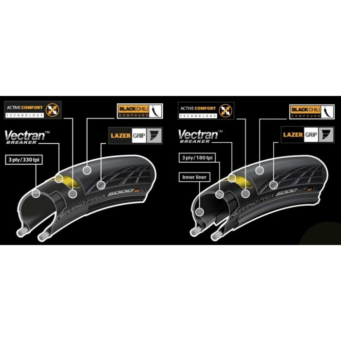 De technologieën die in deze band zijn verwerkt, maken deze uiterst functioneel en gebruiksvriendelijk. Active Comfort Technology is geïntegreerd om rijders een soepele en comfortabele rit te bieden, zelfs op oneffen wegen. Daarnaast heeft de Grand Prix 5000S een aerodynamisch schouderpatroon en toepassing van Lazer Grip Texturing, wat bijdraagt aan een betere wegligging in bochten.