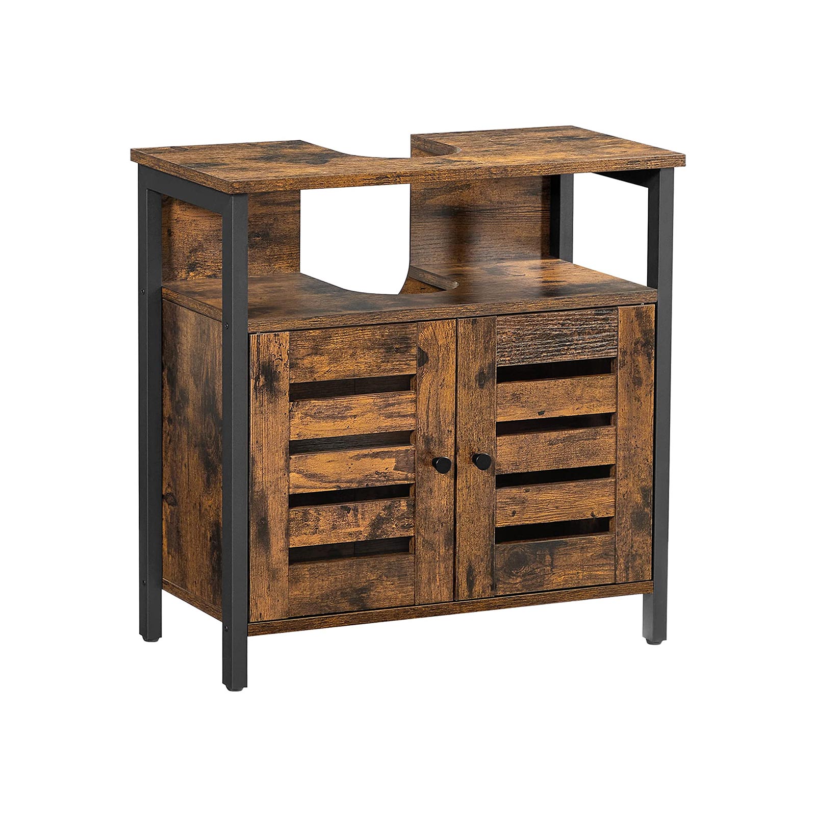 De wastafelonderkast biedt zowel een open vak als een opbergkast met 2 lamellaire deuren. Het open vak is ideaal voor veelgebruikte voorwerpen, terwijl de in 3 niveaus verstelbare plank achter de deuren ruimte biedt voor handdoeken, toiletpapier en andere benodigdheden.