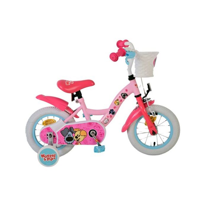 Voor elk kind wordt fietsen een feestje met de Woezel & Pip kinderfiets! Veiligheid staat voorop dankzij de handrem, terugtraprem, gesloten kettingkast en afneembare zijwieltjes. De charmante roze fiets met blauwe details heeft een comfortabel zadel en een extra stevig frame. Het zadel en stuur zijn in hoogte verstelbaar, zodat je er zo lang mogelijk plezier van hebt. Officieel gelicenseerd Woezel & Pip-product.